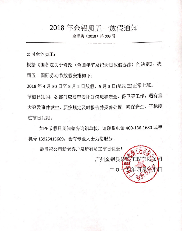 2018年金鋁質(zhì)五一放假通知